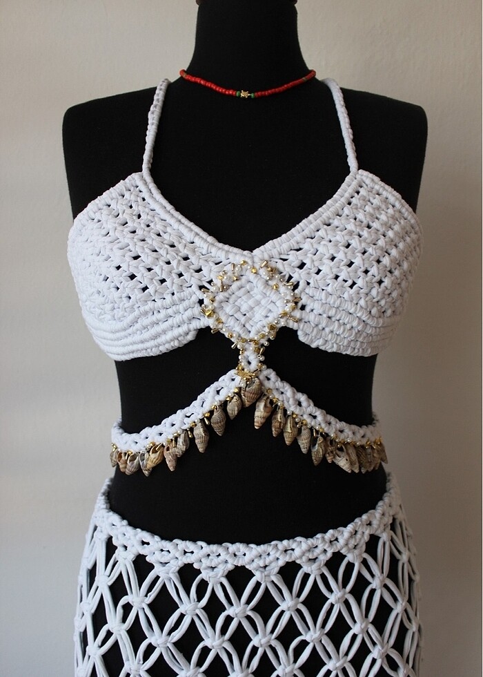 El emeği Plaj File ve bustiyer Kişiye özel tasarım Manken bedeni 38-40 beden Deniz kabukları gerçek El emeği ile dikim yapıldı. Penye ip ile yapıldı. File etek iki yönlü kullanımı uygun. İsterseniz elbise gibi kullanabilirsiniz.