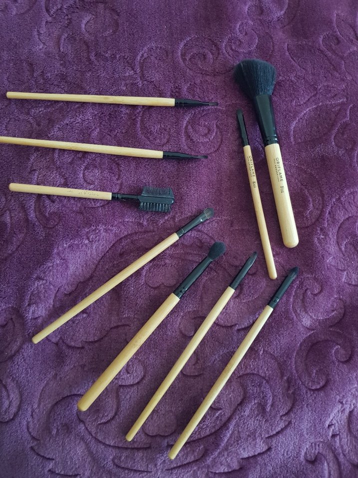 Ahşap saplı ve koyu kıllı farklı makyaj fırçalarından olusan cok az kullanilmis set