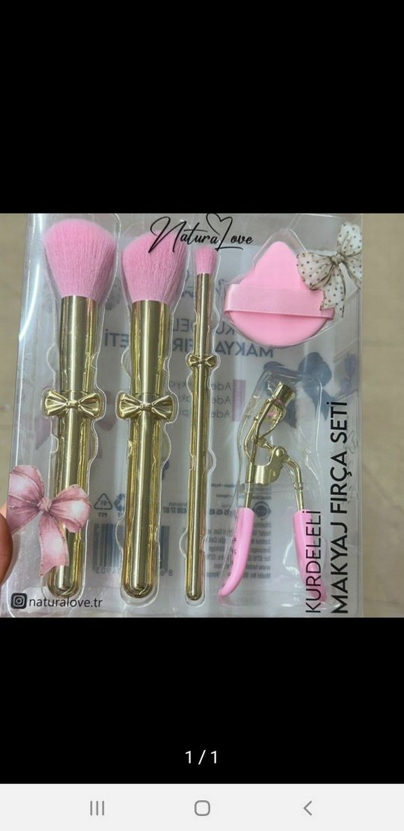 Pastel pembe tonlarında, altın saplı ve fiyonk detaylı üç fırça, sünger ve kirpik kıvırıcıdan oluşan makyaj fırça seti.