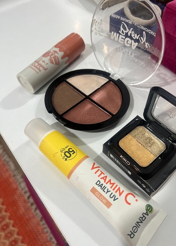 Lovely foncealer, bir kere denedim. Kiko far yepyeni, bir kere denedim Technic mega bronze kahve olanı kullandım, pigmenti çok yüksek Garnier Güneş koruyucu bir iki kere kullandım. Fazla olduğu için satıyorum. Toplu alım için fiyatı düşük tuttum