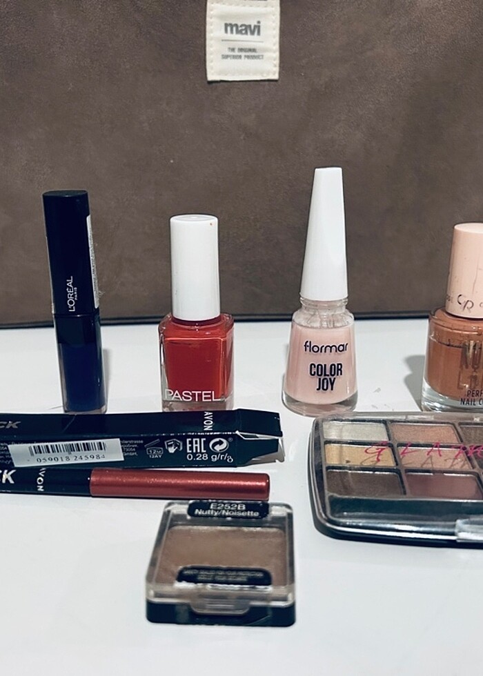 *Loreal likit far - infinite purple (mat koyu mor) Hiç kullanılmadı *Avon asansörlü göz kalemi - bewitching red Yanlış rengi almışım,hiç kullanılmadı *Wet&wild tekli far - nutty (metalik kahve) 2 kere anca kullanılmıştır *Ruby rose 12li far Sadece bir rengi 2 kere kullanıldı *Flormar - 397 Rose coral *Golden rose - 04 Coral nude *Pastelin numarası silinmiş, cırtlak değil de pastel tonlu soft bir kırmızı diyebilirim İhtiyaç fazlasıdır, neredeyse hiç kullanılmadılar Toplu fiyatıdır,ayrı olarak isterseniz ilan açabilirim Bir ojenin 60tl olduğu şu günlerde hepsi için iyi fiyat