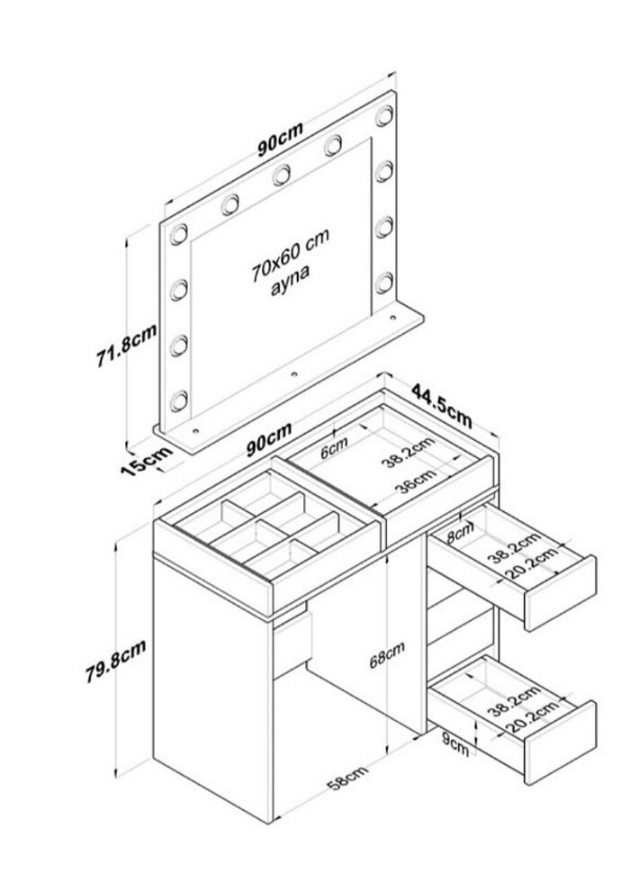 1 Adet Makyaj Masası 1 Adet Ayna 11 Adet Spot Işık Kurulum Şablonu ve Bağlantı Aksesuarları Işık Rengi: Beyaz * Gold kristal kulplar, krom renk olarak güncellenmiştir. * Aynayı raflı ya da rafsız olarak duvara monte ederek kullanabilirsiniz. Ürün her iki kullanıma uygun üretilmiştir. * Aynanın kablo uzunluğu 1,5 metre olup aç - kapat anahtar ile kolayca açıp kapatabilirsiniz. * Çekmece içindeki bölmeler takı, makyaj malzemeleri gibi eşyalarınızı kolayca düzenlemenizi sağlar. Bölmeleri konumlandırmadan da kullanabilirsiniz.
