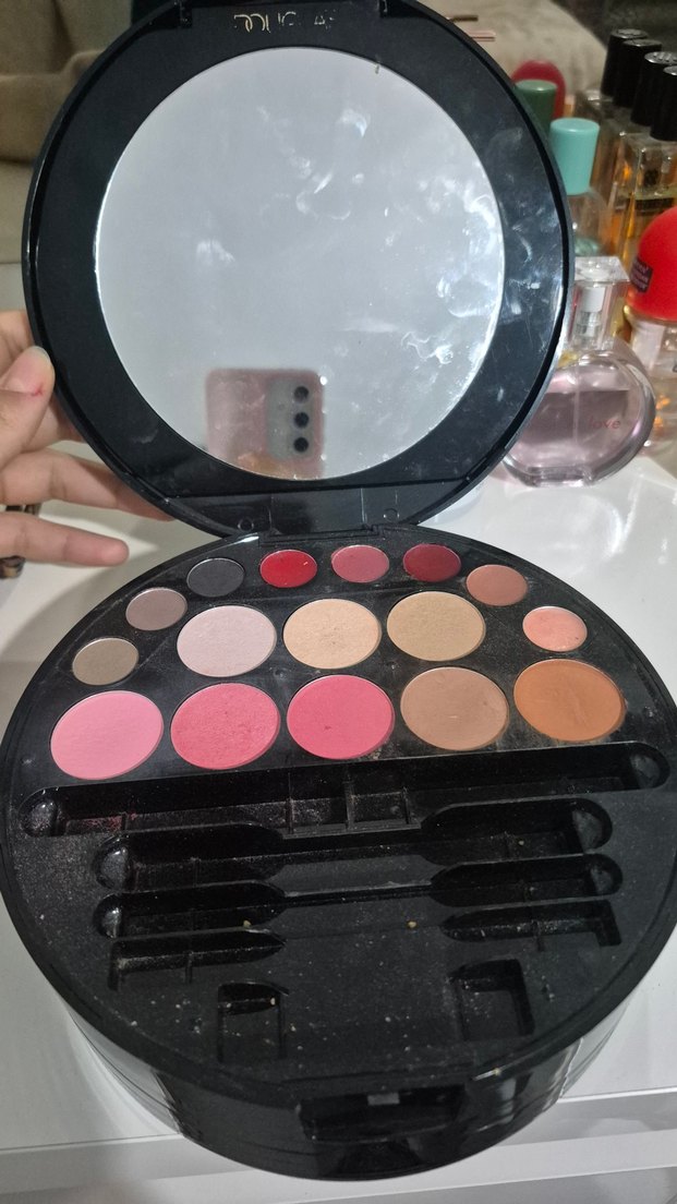 Yuvarlak kompakt içinde ayna bulunan, koyu ve canlı pembe ile kahverengi tonlarında göz farı paleti.