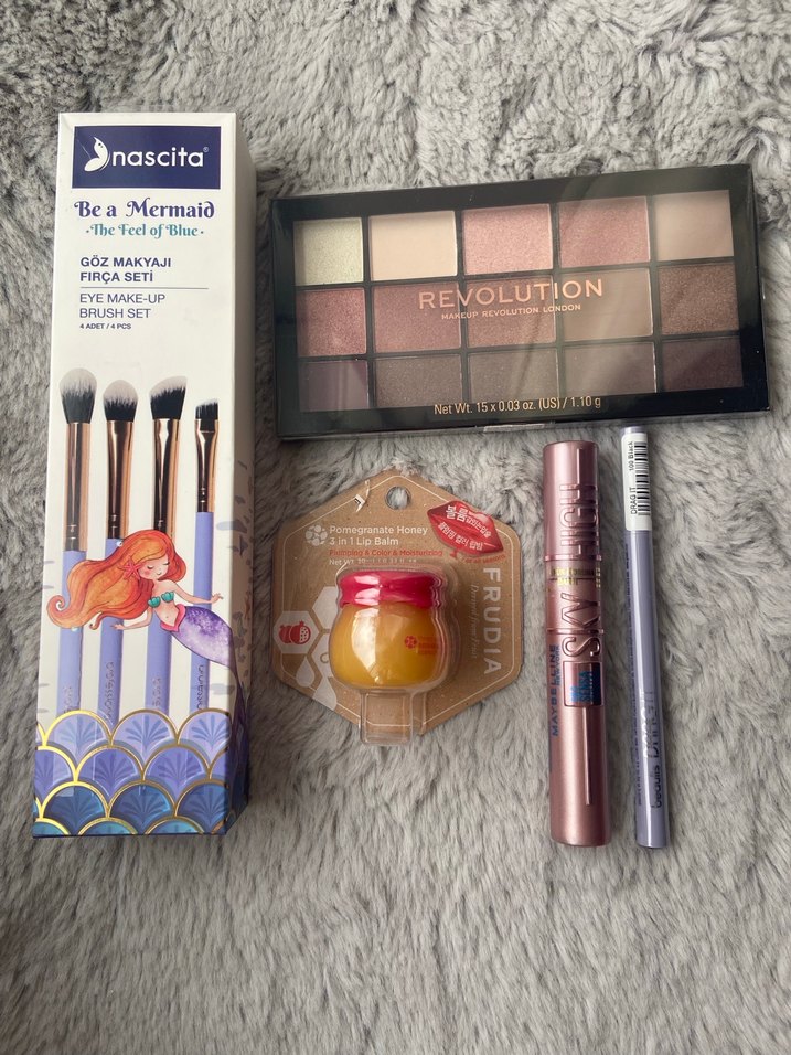 Nascita'dan göz makyaj fırça seti ve Revolution'un açık bej tonlarında far paleti, ayrıca dudak balmı, maskara ve eyeliner içerir. Ürünler sıfırdır.