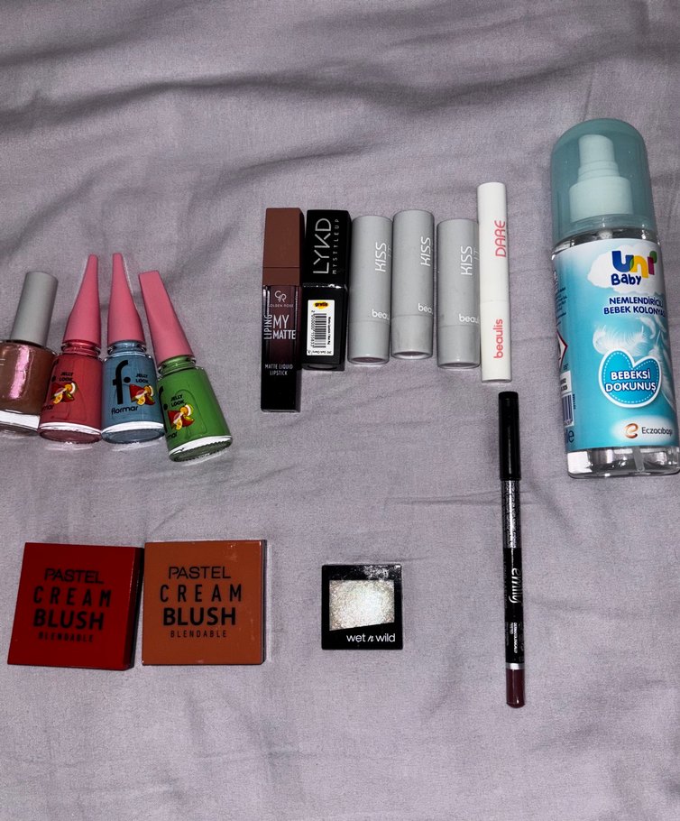 Emily 203 dudak kalemi sıfırdır paketlidir. Rujların renkleri resimlerde bellidir. Birkaç kez kullanılmıştır. Wet n wild simli glitter far 1 kere denemek için kullanılmıştır. Ojeler kullanılmamış full doludur. Pastel turuncu ve kırmızı allık sadece 2 kez kullanılmıştır. Aynı gün özenle paketlenip kargoya verilecektir.