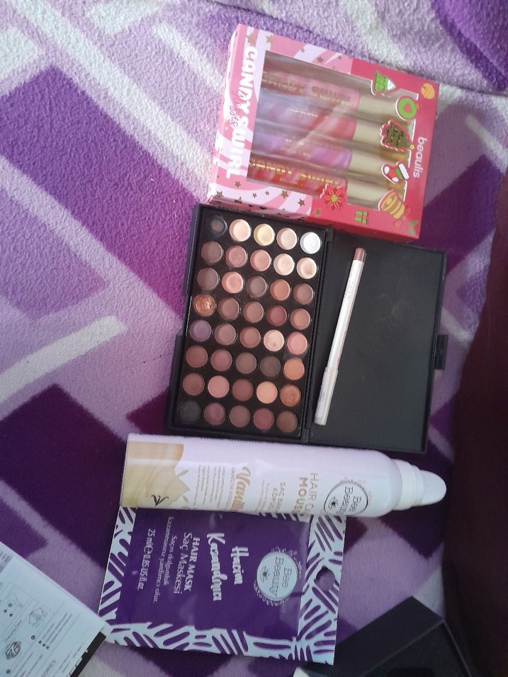 Müjgan marka far paleti az 1 defa kullandım dudak parlaticilarini yeni aldım kullanmadım hiç paketinde vanilyalı saç spreyinin yüzde 90 ı dolu 2 defa kullanmamisimdir saç maskesi gratisten yeni beaulisin 104 numaralı karamel dudak kalemi yanlarında hediye ediyorum jelatini açılmadi