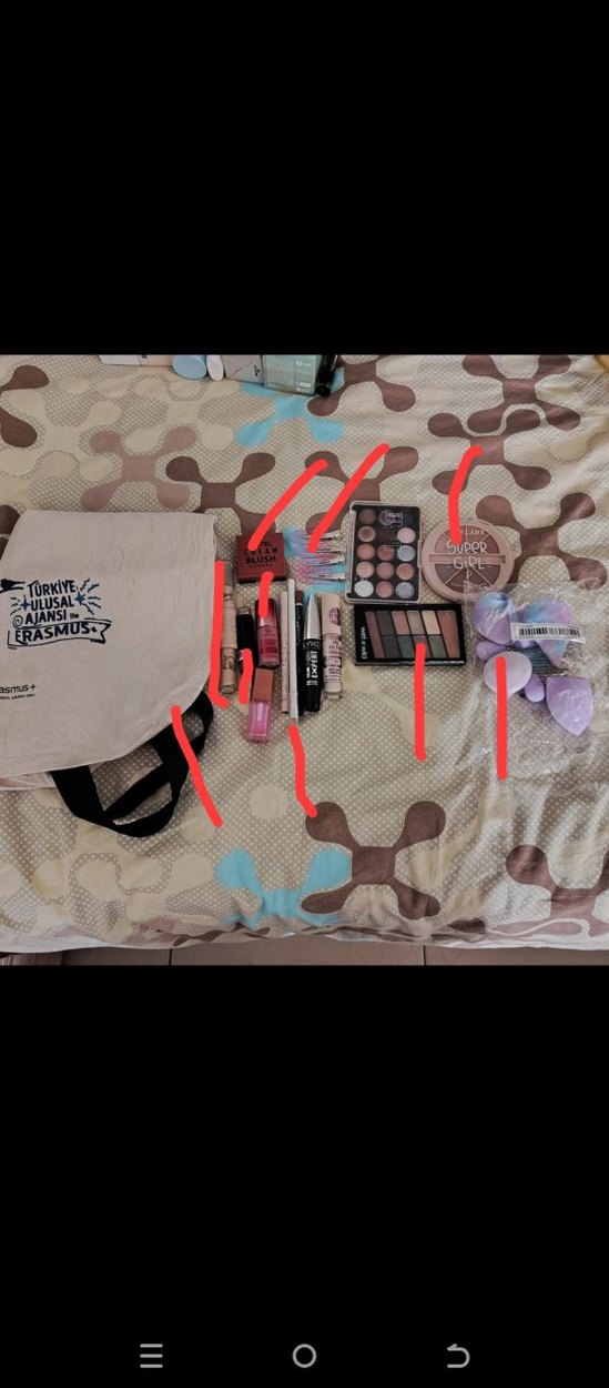 allık( , pastel) , far paletleri( wetnwild, supergirl) , ruj ( note) ,beyaz göz kalemi ( wet n wild), makyaj süngerleri ve pudra pufu,emily(203), ,saç tokaları (pembe) oluşan makyaj seti. Açık bej renkli çantası ile.revolution highlighter, pastel daylight highlighter
