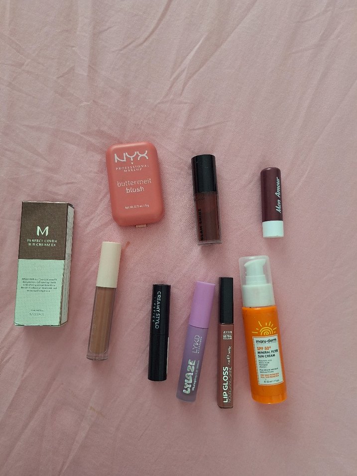 NYX pastel pembe allık ve M markasına ait çeşitli ruj ve parlak ürünlerden oluşan makyaj seti. Yumuşak ve kullanışlı tonlarda.