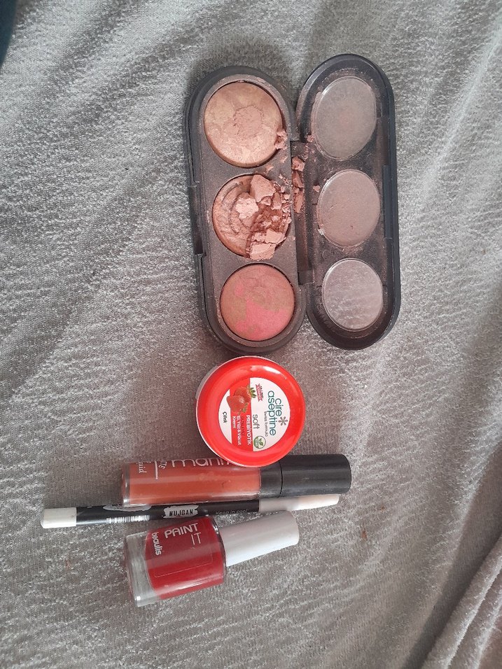 kremi çok az kullandım tamamı dolu allıklari kullanmıyorum satiyorum ortadaki kırıldı oje 2 defa kullanıldı göz kalemini kullanmadım hiç likit ruju da hiç kullanmadım rengini beğenmedim