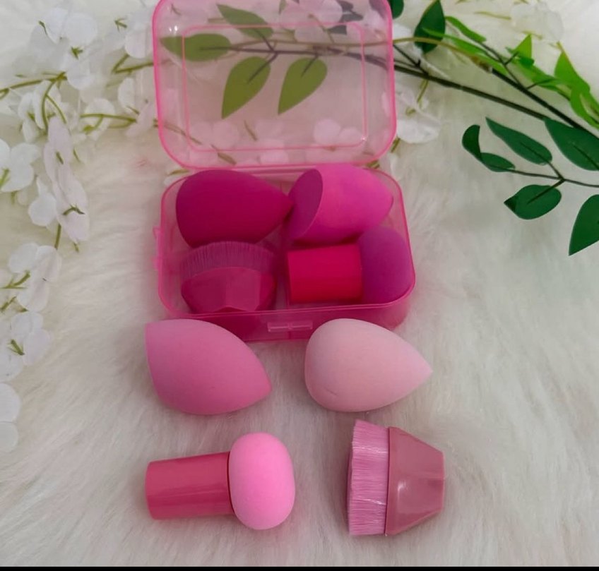 Pastel pembe renkte farklı şekillerde makyaj süngerleri ve fırçalar, şeffaf pembe kutuda saklanmaktadır. Yumuşak dokulu ve pürüzsüz uygulama sağlar.