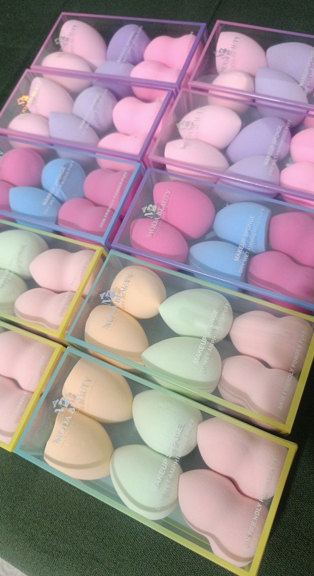 Çeşitli yumuşak tonlarda pastel renkli makyaj süngerleri seti, pürüzsüz uygulama için yuvarlak şekilli süngerler içerir.
