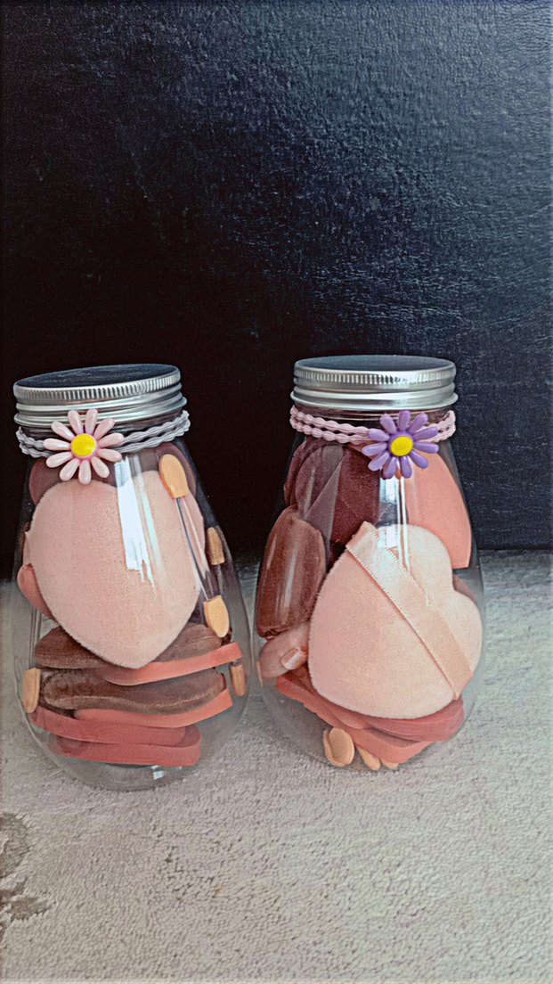Pastel pembe tonlarında, farklı şekillerde makyaj süngerleri, şeffaf kavanozlarda ve çiçekli bantlarla saklanmıştır.