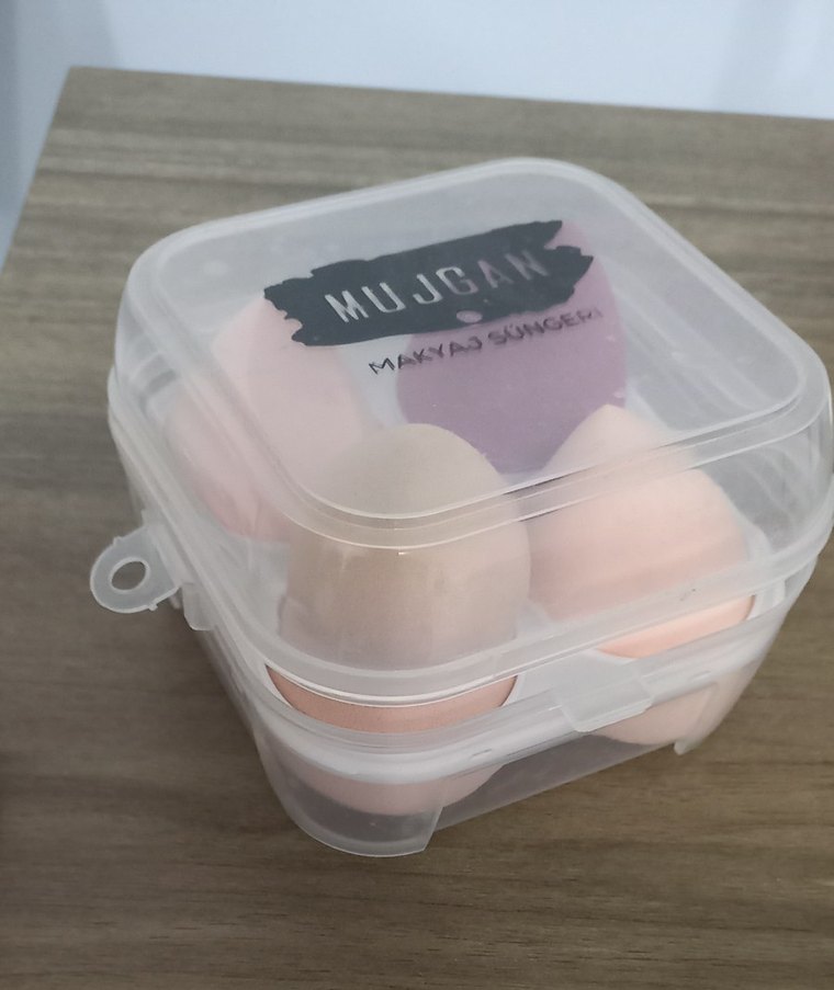 MUJGAN etiketli şeffaf kutuda pastel pembe makyaj süngerleri. Yumuşak yapısıyla pürüzsüz makyaj uygulamasına yardımcı olur. #makyajsüngeri#kapatıcısüngeri#sünger