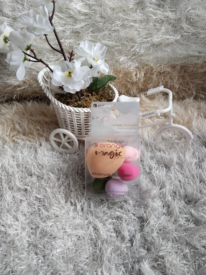Pastel pembe renklerde makyaj süngeri seti, pürüzsüz uygulama için çeşitli süngerler içerir. Ambalajda "magic" yazısı vardır.