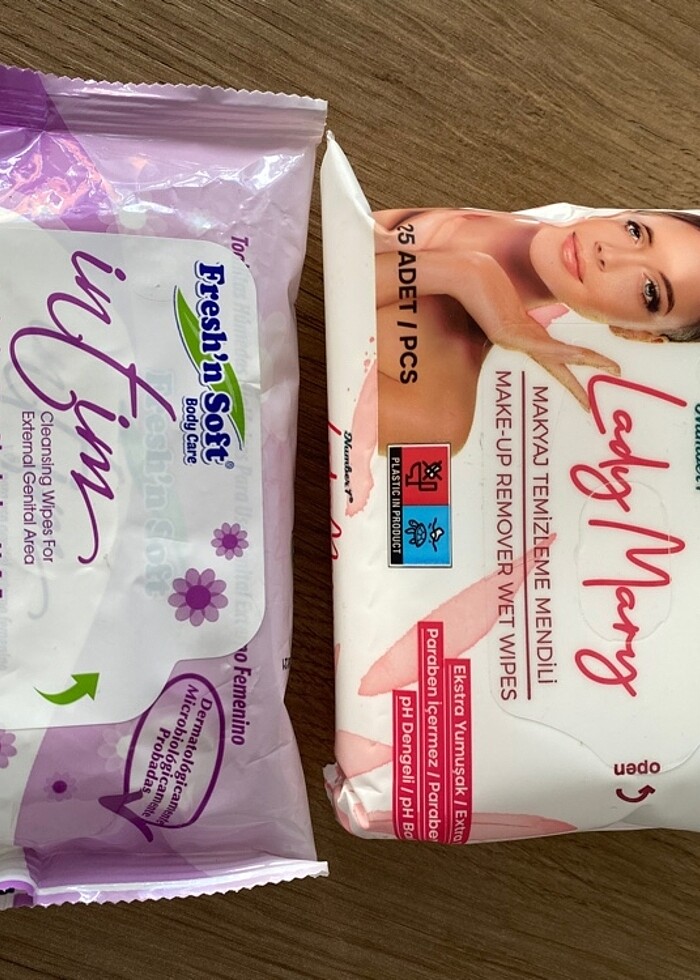 1 paket Makyaj temizleme mendili ve 1 paket İntim temizleme mendili fiyatıdır. Ürünler hiç açılmamıştır. Son kullanma tarihleri görsellerde mevcut