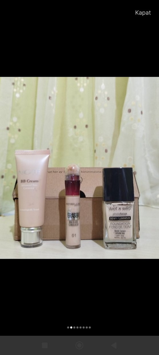 1 adet Note Markalı BB Krem. Gratisten alındı. Hiç kullanılmadı. 1 adet Wet N Wild MARKALI Fondöten Soft Beige Gratis mağazasında renk tonuna bakmak için jelatini söküldü. Hiç kullanılmadı. 1 adet Maybelline Kapatıcı 01 Renk tonu için Gratis mağazasında renk tonuna bakmak için jelatini söküldü. Hiç kullanılmadı.