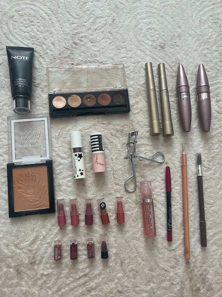 Bej ve açık tonlarda far paleti, rujlar, maskaralar, kaş jeli ve makyaj fırçaları içeren makyaj ürünleri seti. Fotoğraftaki tüm ürünlerin toplu fiyatıdır