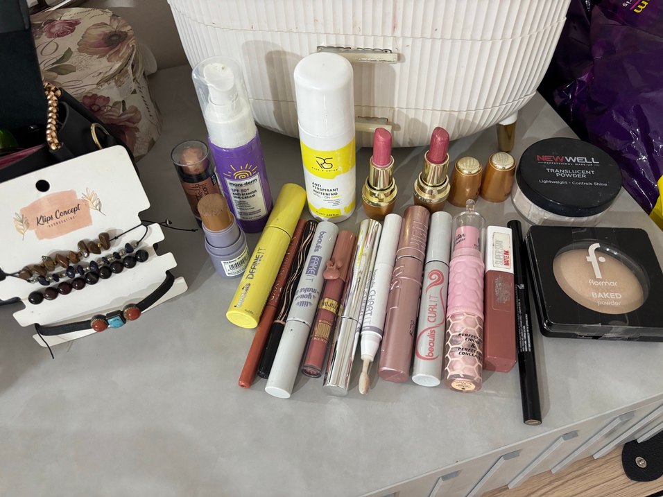 canlı renklerde ruj, maskara, kapatıcı ve cilt bakım ürünleri içeren makyaj seti.