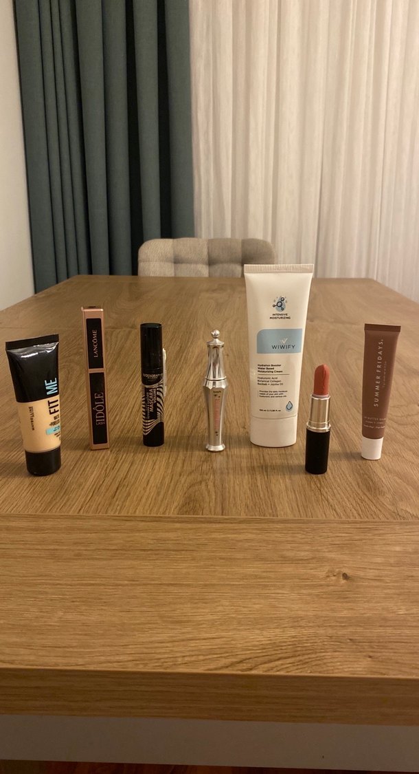 Çeşitli markalardan fondöten, maskara, ruj ve cilt bakım ürünlerini içeren açık bej tonlarında makyaj seti. Sadece bir kez kullanıldı