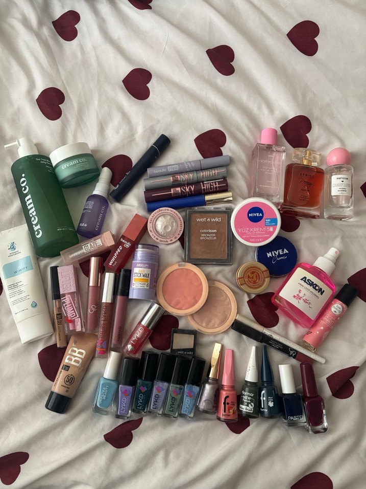 Çeşitli markalara ait makyaj ve cilt bakım ürünleri. Oje, allık, ruj ve kremler dahil.ALMADAN İLAN AÇTIRIN