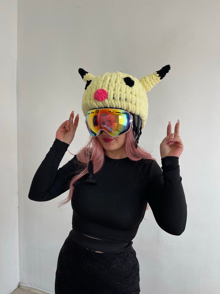 Pop kültür ve avangart tarzdan ilham alan, oyuncu boynuzlu, sarı örgü bere. Rock punk havası için ideal.