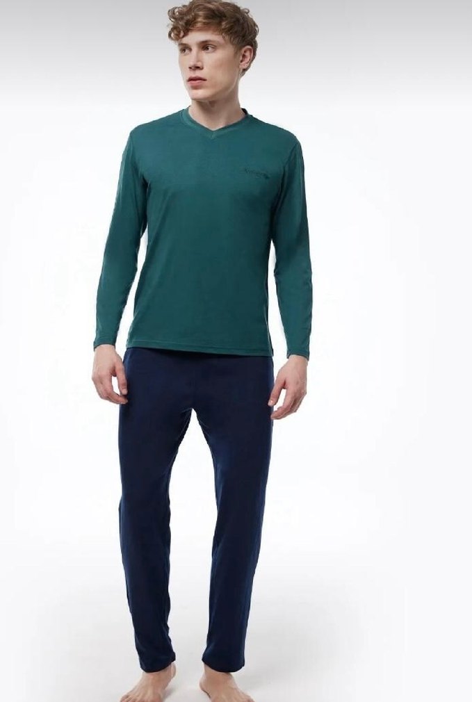 Erkekler için koyu yeşil uzun kollu, yuvarlak yakalı ve normal kesim üst ile koyu renk pantolonlardan oluşan rahat ve şık pijama takımı.