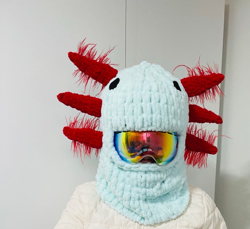 Çok renkli, örgü kadın bere; kırmızı tüylü sivri detaylarla avant-garde tarzını yansıtıyor. Baş ve boynu kapatan, yumuşak ve sıcak dokulu bir model.