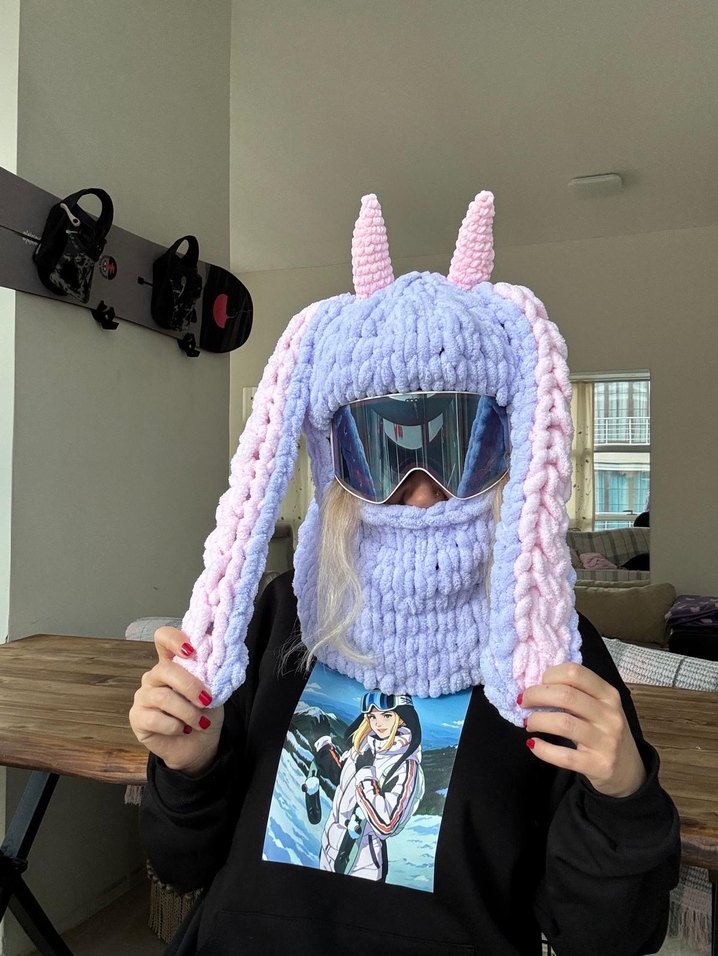 Mor ve pembe pastel tonlarında, boynunu da kapatan örgü kadın bere, özgün boynuz detayları ve uzun örgü saçlarıyla rahat ve avant-garde tarz sunar.