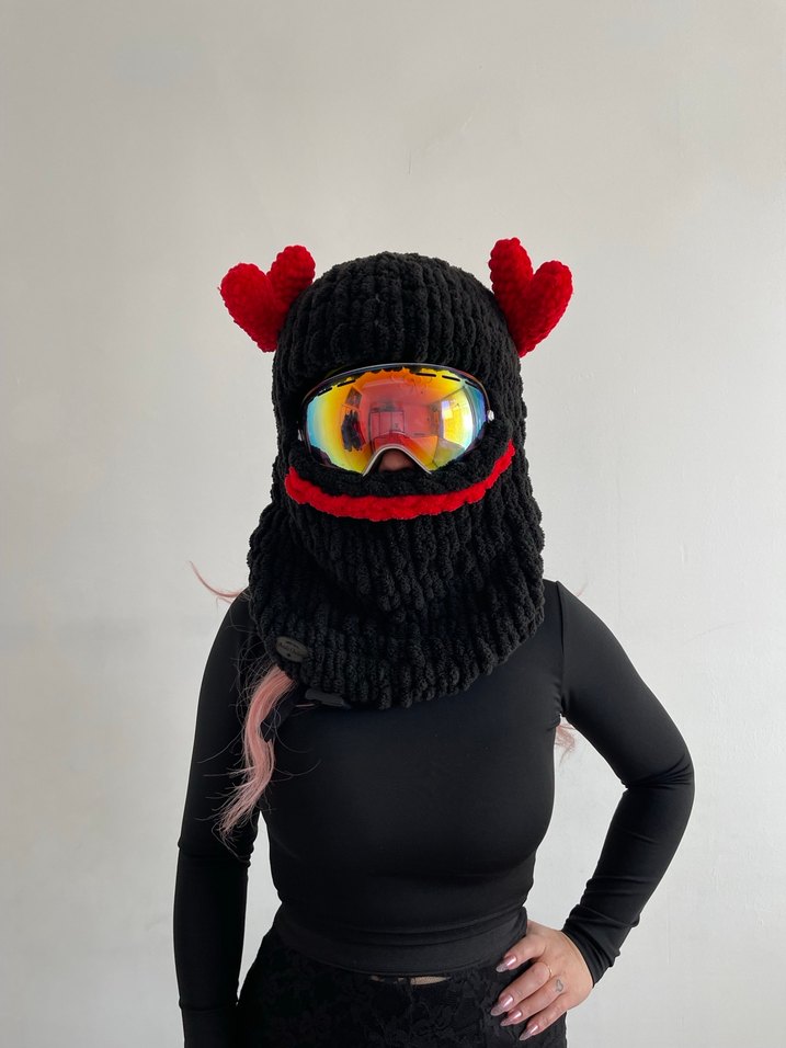 Kırmızı kalp detaylı siyah örgü kadın bere, yüzü kapatan avant-garde tasarıma sahiptir. Trend belirleyiciler için uygundur.