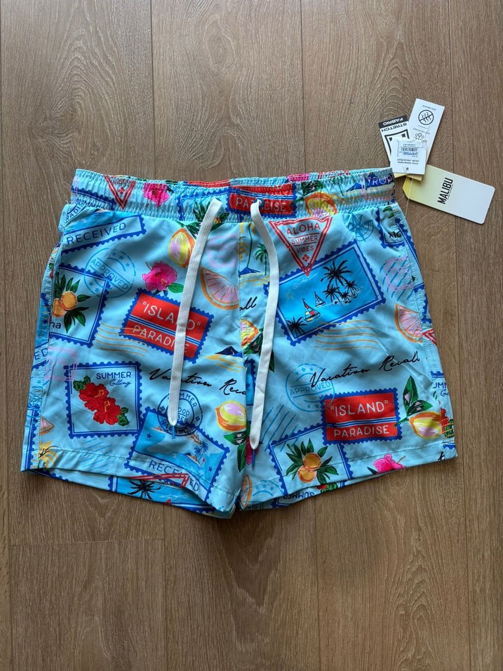 Renkli baskılı, bol kesim erkek mini deniz şortu. Yazlık ada temalı desenleri var. Amerika’dan hediye olarak geldi, ancak beden uymadığı için satmak durumdayız. Ürün orijinal lüks Malibu markasının deniz şortu, etiketiyle beraber mevcut. İnternet sitesindeki fiyattan satıyorum.