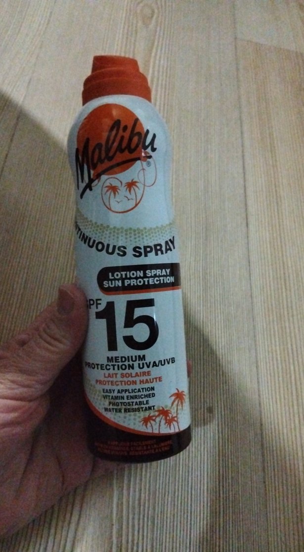 Malibu SPF 15 güneş spreyi, orta düzey UVA/UVB koruması sağlar. Vitamin E içerir, suya dayanıklıdır ve kolay uygulanır.