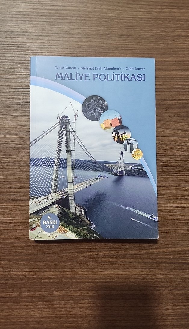 "Maliye Politikası" adlı kitap, maliye politikası konularını detaylı açıklamalar ve görsellerle ele alıyor. Kapakta köprü ve ekonomik semboller yer alıyor.