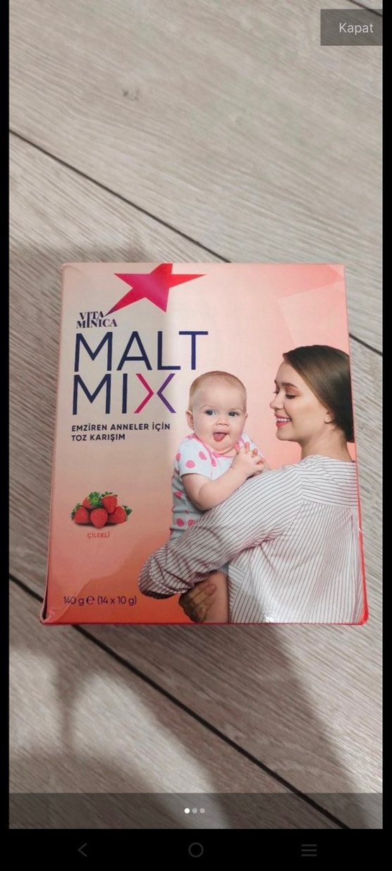 Çilek aromalı Malt Mix, emziren anneler için toz karışım. 140g (14x10g) paket halinde sunulur.