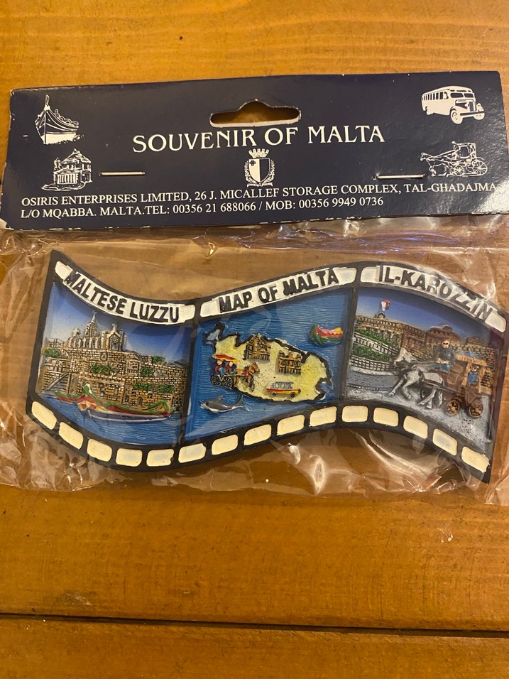 Malta'nın haritası ve simgeleri ile renkli bir magnet hatıra, Maltese Luzzu ve Il-Karozzin figürleri içerir. Seyahat severler için uygun.