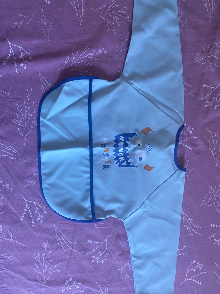 Uzun kollu bebek önlüğü, pastel mavi renkte ve üzerinde baskılı aç canavar deseni bulunur. Yemek sırasında ekstra koruma sağlar.