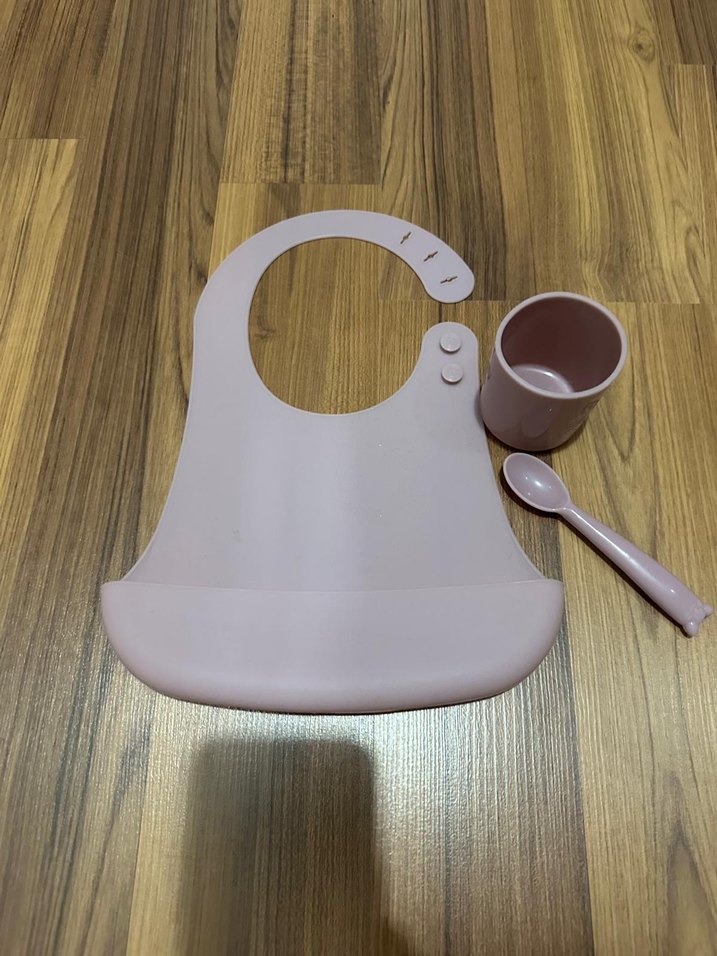 Ayarlanabilir boyun kısmı ve döküntüleri yakalayan cep bulunan gul kurusu tonlarinda bebek önlüğü, yanında uyumlu bardak ve kaşık seti ile birlikte. Hic kullanilmadi sifir.Hediye gelmisti kizim hic onluk takmak istemedi malesef.