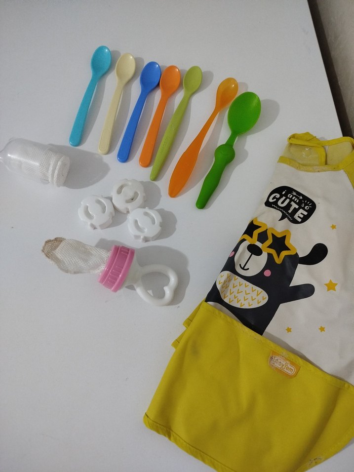 bir adet önlük,6 mama kaşığı, üç adet meyve filesi ikisi sıfır biri az kullanılmış filenin kullanma Aparatı da dahil, üç adet priz koruma kapağı da hediye
