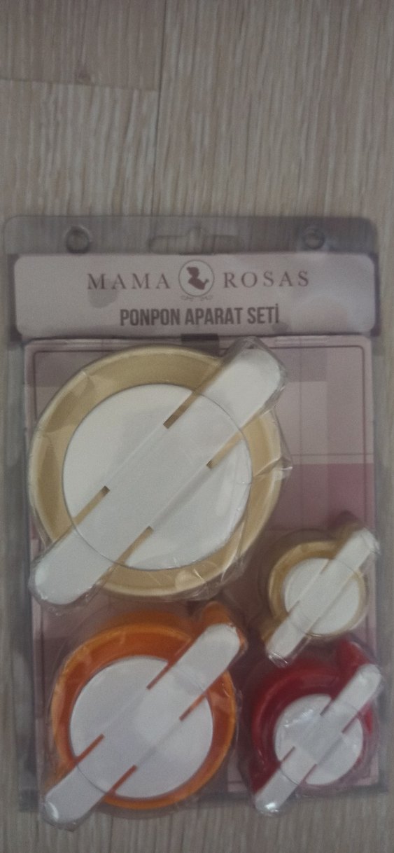 Mama Rosas Ponpon Aparat Seti, farklı boylarda ponponlar yapmanızı sağlayan aparatları içerir. Bej renkli ve baskılı tasarıma sahiptir.