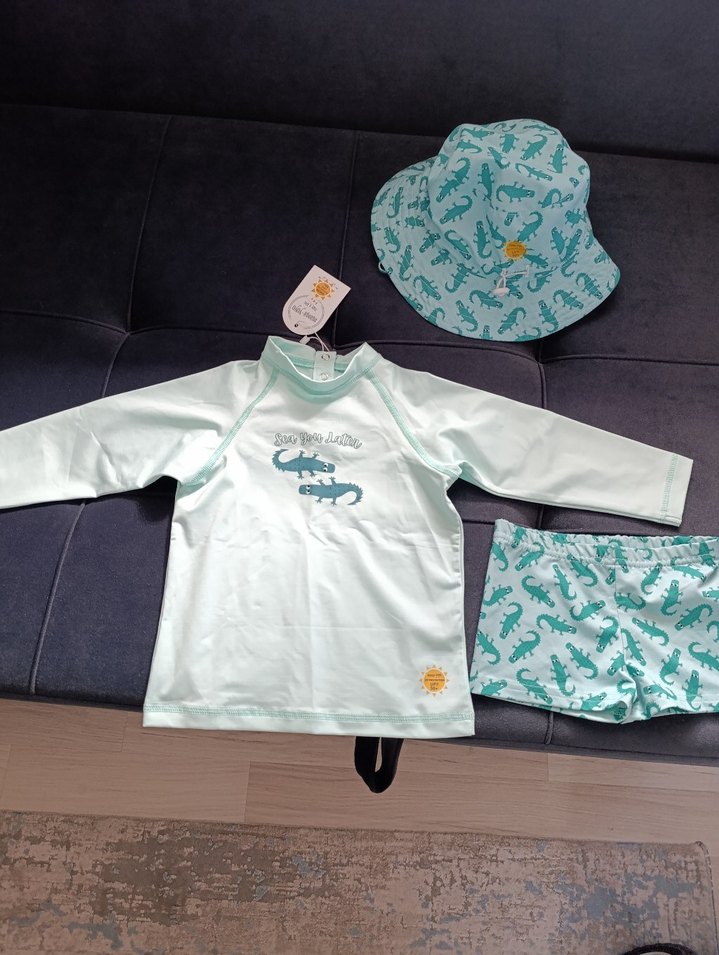 Uzun kollu, baskılı timsah desenli turkuaz erkek çocuk mayo üstü, uyumlu şort ve baskılı şapka içerir. hiç kullanılmadı