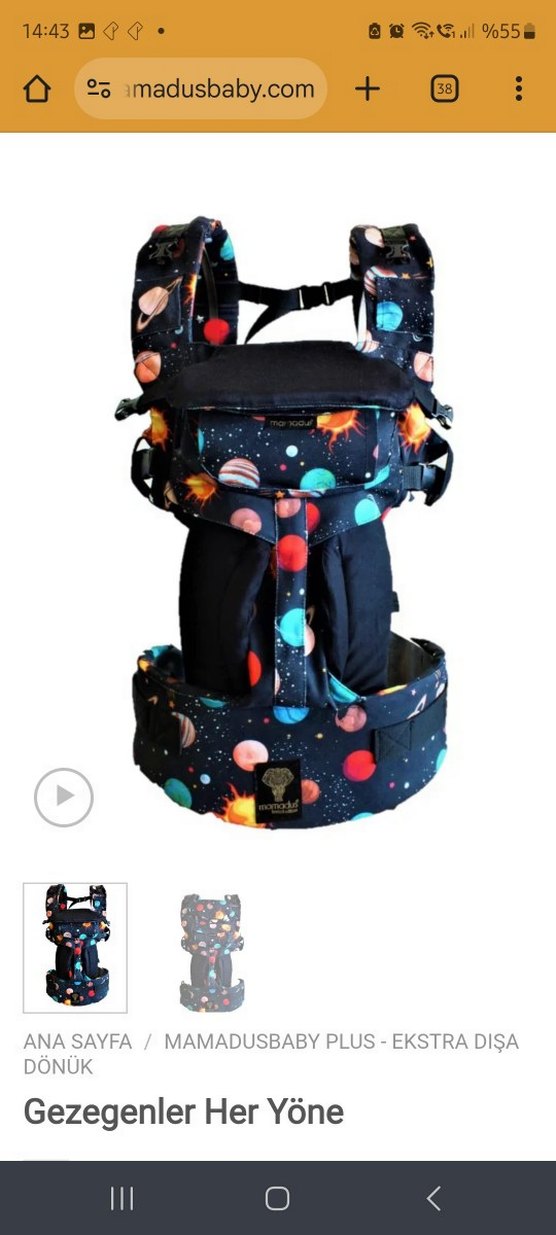 Çok renkli gezegen desenine sahip kanguru, ayarlanabilir askılar ve yastıklı bel desteği var. Bebek dışa doğru etrafı seyrederek de gezebiliyor. 1 2 kez kullanabildim hareketli bebeğim durmadı.