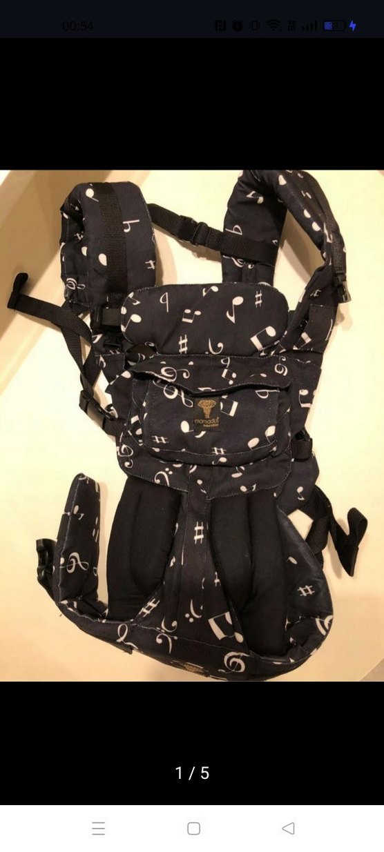 Ayarlanabilir askılı, müzik notaları desenli siyah bebek taşıyıcı. Konfor için yastıklı destek sunar.. yenidogan aparati mevcuttur