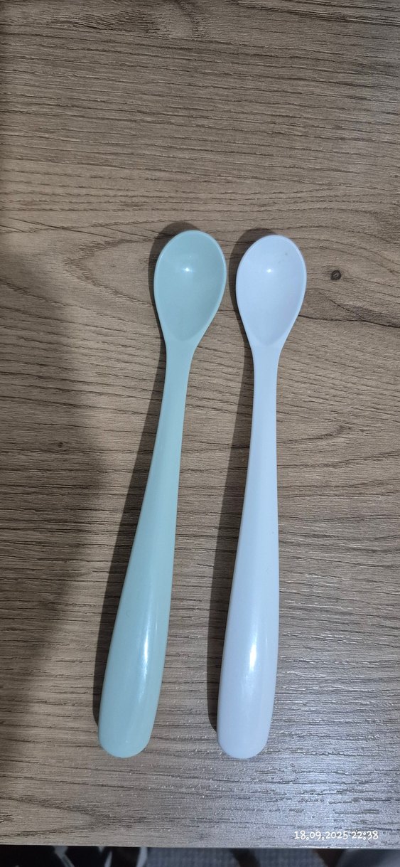 Pastel mavi ve beyaz renkte, çocuklar için tasarlanmış iki kaşık. Hafif ve kolay tutulur. ️az kullanıldı.