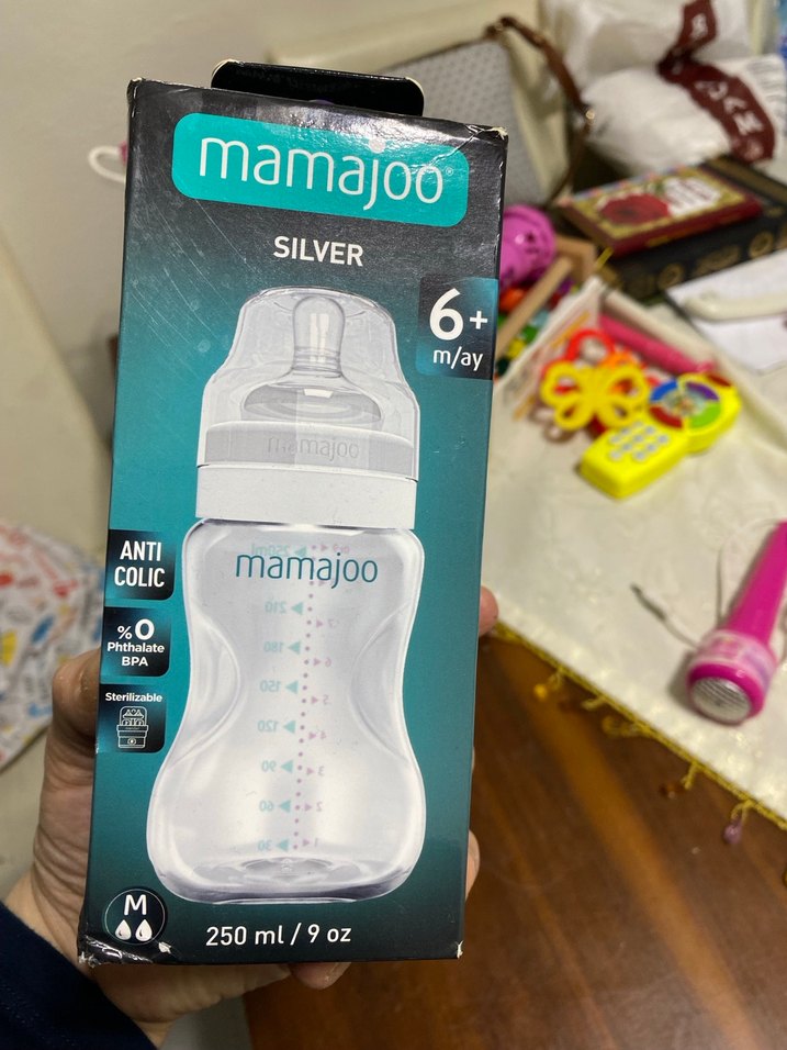 Mamajoo gri/beyaz renkli, 6 ay ve üzeri bebekler için anti kolik özellikli 250 ml biberon. BPA içermez ve sterilize edilebilir.