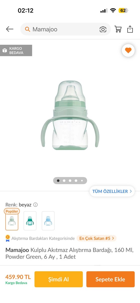 Yeşil pastel renkte, kolay tutulabilen saplı ve yumuşak uçlu alıştırma bardağıdır. Alıştırma bardakları kategorisinde popülerdir. Hiç kullanılmadı ama yıkandı ve dezenfekte edildi