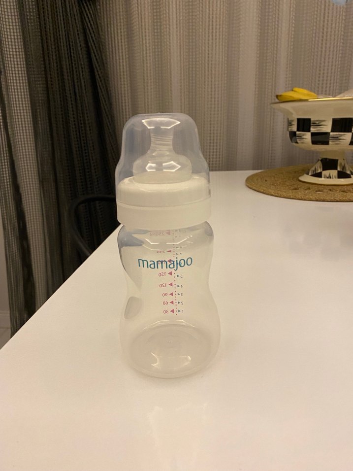 Mamajoo bebe biberonu, beyaz ve gri renkte, ölçü işaretleri ve koruyucu kapaklıdır. 2 - 3 kez kullanıldı sıfır sayılır görseldeki gibi