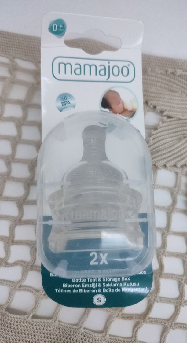 Mamajoo bebe biberonu emziği 2'li set halinde, BPA içermeyen malzemeden üretilmiştir. Saklama kutusu da pakete dahildir.