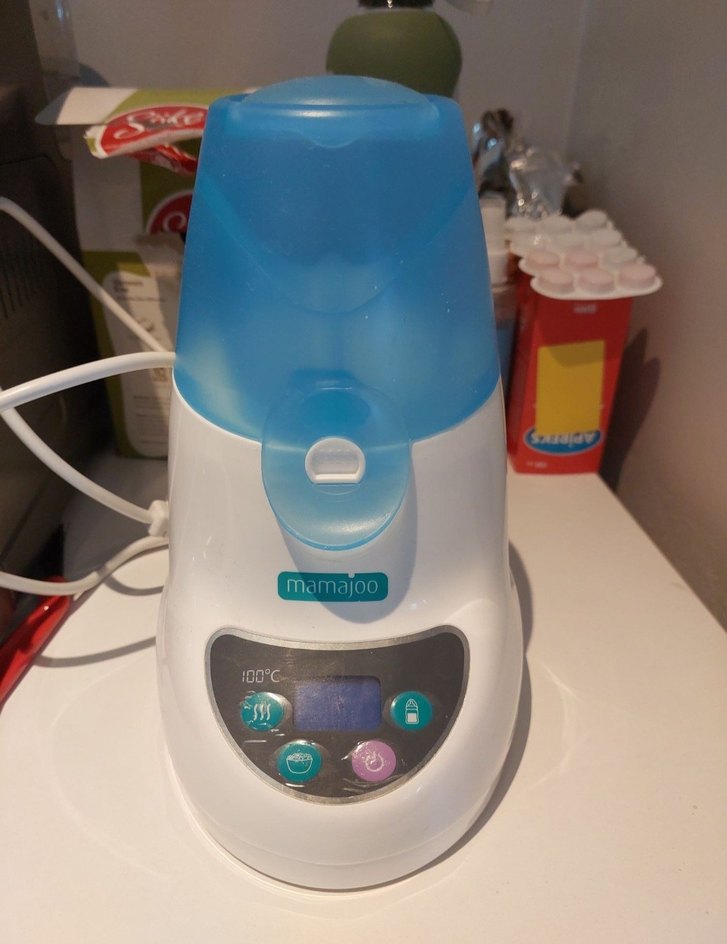 Mamajoo marka beyaz bebek mama ısıtıcı, kullanımı kolay kontrol paneli ve açık mavi kapak ile bebek mamasını güvenle ısıtır. Ürünü sterilizasyon ve mama ısıtma amacıyla kullandım. Pratiklik açısından iş görüyor kolaylık sağlıyor . 4. fotoğraftaki işaretli kutulu kase eksik sadece kaybetmişim çünkü gıda ısıtma işlemi yapmadım hiç. Temizdir. Sorunu yoktur. Özelliklerini içeren açıklama, son fotoğraftadır.