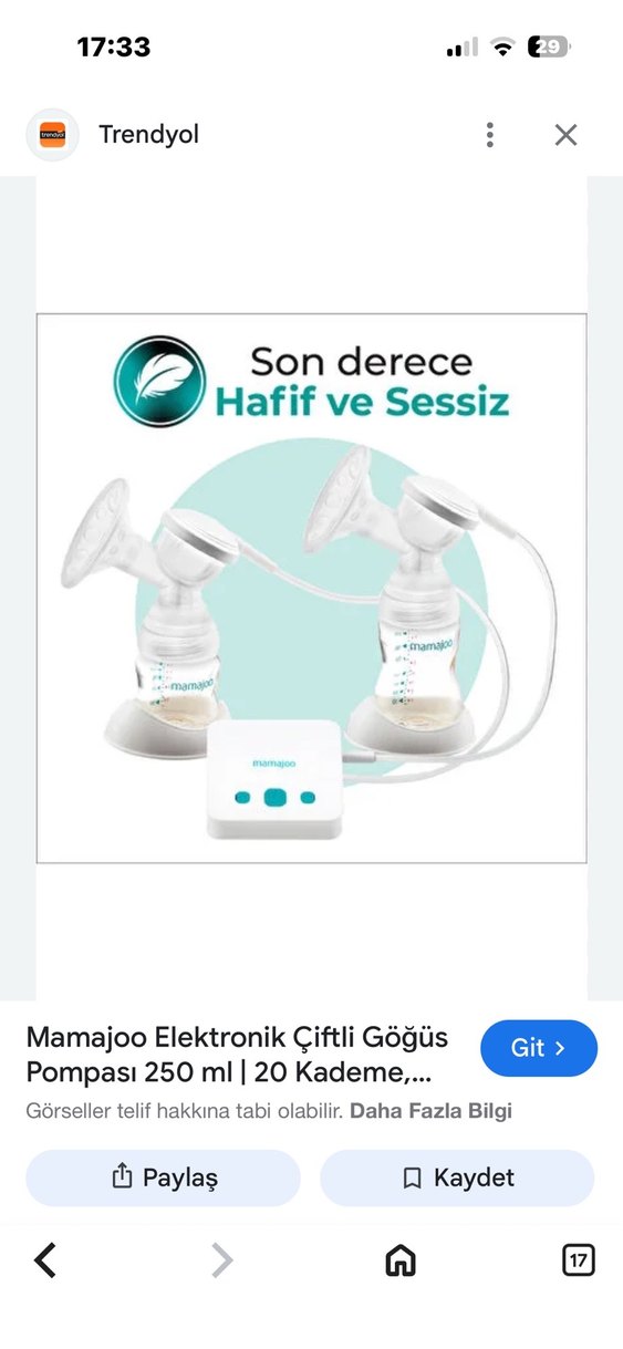Mamajoo elektronik çiftli göğüs pompası 250 ml kapasiteye ve 20 kademeye sahiptir. Son derece hafif ve sessiz çalışır. Kullanılmış üründür almadan önce yazınız