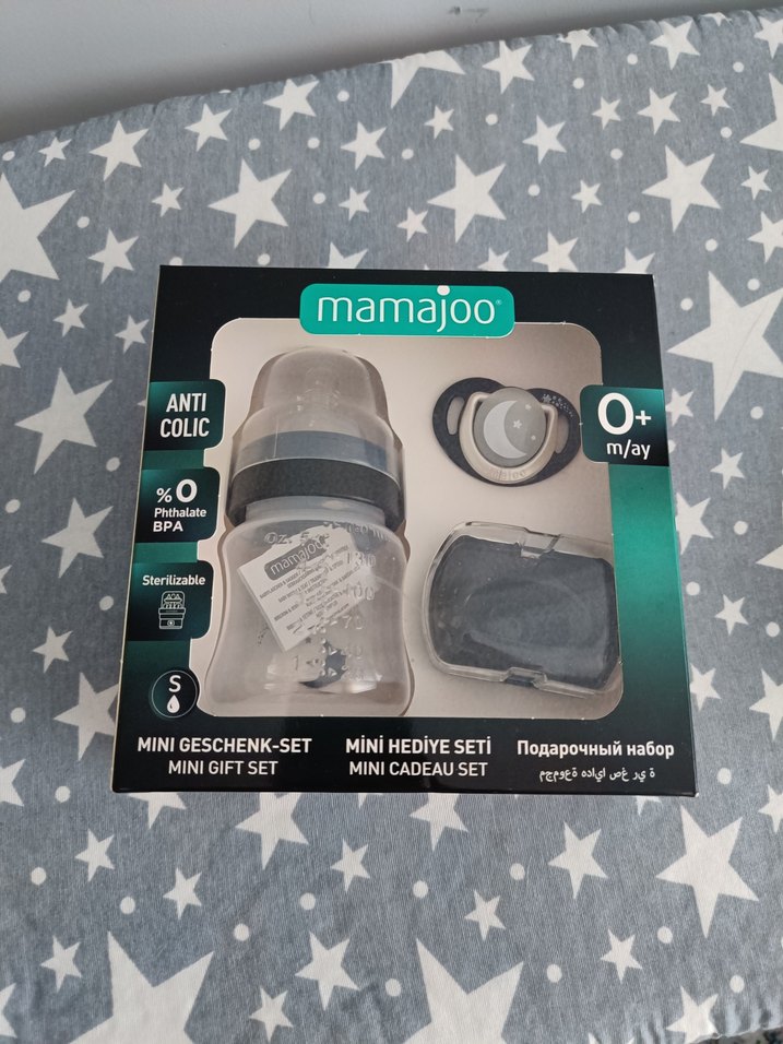 Mamajoo mini hediye seti; gri anti kolik bebek biberonu, emzik ve saklama kutusu içerir. BPA ve ftalat içermez, 0+ ay için uygundur, sterilize edilebilir.