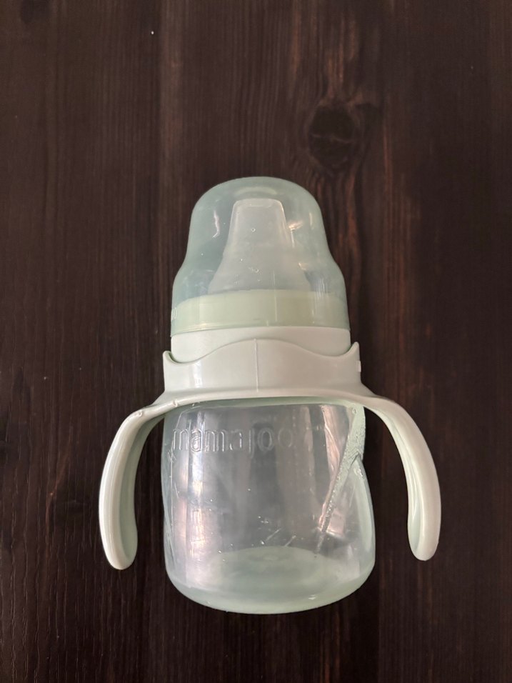 Yeşil mamajoo tutma kulplu bebek suluğu.Yumuşak emzik ve koruyucu kapak içerir, bebekler için uygundur.
